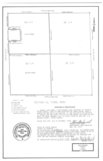 TERMS: Cash – A 10% nonrefundable earnest money payment on the day of the sale with the balance on or before December 27, 2024, with full possession for the 2025 crop year. Subject to the rights of the current tenants to harvest the 2024 crops in accordance with the 2024 farm lease. A Warranty Deed will be conveyed, and an Owner’s Title Insurance Policy will be provided with the cost of the owner’s policy and closing agents fee divided 50-50 between the buyer & seller. This property is sold based on the acres determined by a survey completed by Thomas Weeks – Registered Land Surveyor, with the acres understood to be “more or less”. All of the 2023 RE Taxes payable in 2024 as well as the 2024 RE taxes payable in 2025 will be paid by the sellers. The sellers do not warranty or guarantee that existing fences lie on the true & correct boundary and new fencing, if any, will be the responsibility of the purchaser pursuant to SD law. FSA yields, bases, payments or other info. is estimated and subject to County Committee approval & if these parcels are sold separately will be subject to FSA reconstitution. Information contained herein is deemed to be correct but is not guaranteed. This property is sold subject to existing easements, restrictions, reservations or highways of record, if any, and subject to any Co. Zoning Ordinances. The RE licensees in this transaction stipulate that they are acting as agents for the sellers. Sold subject to confirmation of the Owners.