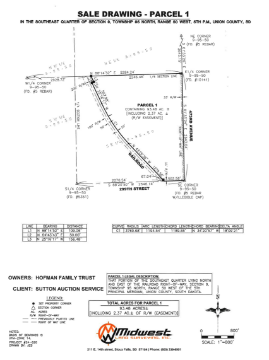 TERMS: Cash – A 10% nonrefundable downpayment on the day of the sale and the balance on or before March 14, 2025 with landlord’s possession and full possession subsequent to the harvest of the 2026 crops. The buyer will assume the existing cash lease calculated as 90 acres at $250.00 per acre for a total annual cash rent of $22,500.00 per year, payable in the sum of $11,250.00 on 3/01/2025, $11,250.00 on 10/01/2025, $11,250.00 on 3/01/2026, $11,250.00 on 10/01/2026; AS AN ADDITIONAL BENEFIT TO THE BUYER – The Sellers have agreed to pay a rental enhancement of $75.00 per acre over and above the $250.00 cash rental rate, thus the total rental rate to the buyer will actually be a total of $325.00 per acre – this enhanced rental rate of $75.00 per acre on 90 acres or $6,750.00 per year multiplied by 2 years for a total rental enhancement of $13,750,00 that will be paid IN FULL to the Buyer at closing. Marketable Title will be conveyed and an owner’s title insurance policy will be provided with the cost of the owner’s policy and the closing agent’s fee to be divided 50-50 between the buyer(s) and sellers. All of the 2024 RE taxes payable in 2025 will be paid by the trust. The total acres being sold are being sold in accordance with a survey as completed by Midwest Land Surveying, Inc., with the acres understood to be “more or less”. All survey costs will be paid by the sellers. The sellers do not guarantee that existing fences lie on the true and correct boundary and any new fencing, if any, will be the responsibility of the purchaser(s) pursuant to SD Law. FSA cropland, yields, bases & other information is estimated and not guaranteed and are subject to county committee approval. Information contained herein is deemed to be correct but is not guaranteed. This property is sold in “AS IS” CONDITION and subject to any existing easements, restrictions, reservations or highways of record if any, as well as any or all Union County Zoning Ordinances. The RE licensees in this transaction are acting as agents for the seller. Sold subject to confirmation of the Trustee.