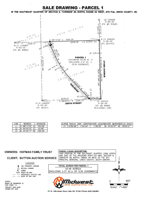 LEGAL DESC.: The SE¼, Lying North and East of the RR ROW, Sec. 9, T. 95N. R. 50W., (Prairie Twp.), Union Co., SD.