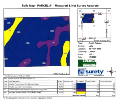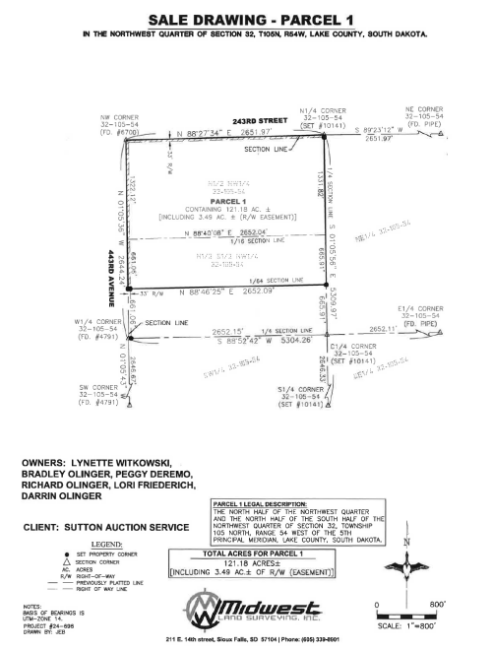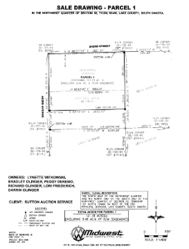 TERMS: Cash – A 10% nonrefundable earnest money payment on the day of the sale with the balance on or before March 21, 2025, with full possession for the 2025 crop year. Marketable Title will be conveyed and an Owner’s Title Insurance Policy will be provided with the cost divided 50-50 between the buyer & seller. Title Company Closing Fees, if any will be divided 50-50. This property is being sold based on the acres as stated on a recent survey of the parcels as completed by Midwest Land Surveying Inc., with the acres understood to be “more or less”. All of the 2024 RE taxes payable in 2025 will be paid by the sellers. The sellers do not warranty or guarantee that existing fences lie on the true & correct boundary and new fencing, if any, will be the responsibility of the purchaser(s) pursuant to SD law. FSA cropland acres, yields, bases & other information is estimated and will be subjected to an FSA Reconstitution, County Committee Approval and pending Congressional Action on the future USDA Farm Bill. This property is sold in “AS IS” CONDITION and subject to any existing easements, restrictions, reservations or highways of record if any, as well as any or all Lake County Zoning Ordinances. The RE licensees in this transaction are acting as agents for the sellers. Sold subject to confirmation of the Owners.