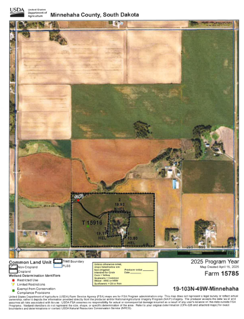 AUCTION TERMS: Cash - A 10% non-refundable downpayment on the day of the sale and the balance on or before January 8th 2026, although not prior to Jan 1st, with full possession for the 2026 crop year. Marketable Title will be conveyed and owner’s title insurance will be provided w/the cost of the owner’s policy and a closing agent’s fee, if any, each to be divided 50-50 between the buyer(s) & seller. All of the 2025 RE taxes payable in 2026 will be paid by the sellers. The acres in this farm are based on the acres as determined in a survey as completed by Midwest Land Surveying, Inc., with the acres understood to be “more or less”. The sellers do not guarantee that existing fences lie on the true and correct boundary and any new fencing, if any, will be the responsibility of the purchaser pursuant to SD Law. FSA cropland acres, yields, bases, payments & other information are estimated and not guaranteed and are subject to implementation of the New Farm Bill & County Committee Approval. Information contained herein is deemed to be correct but is not guaranteed. This property is sold in “AS IS CONDITION” and subject to any existing easements, restrictions, reservations or highways of record if any, as well as any or all Minnehaha County Zoning Ordinances. The RE licensees in this transaction are acting as agents for the sellers. Sold subject to confirmation of the Owners.
