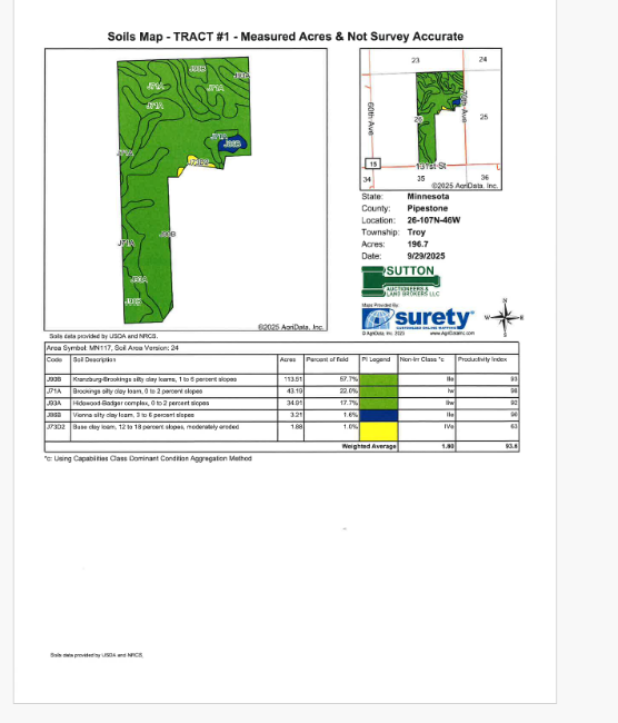 This auction presents a great opportunity to purchase a productive parcel of farmland and pastureland with the cropland acres being inclusive of some high caliber productive soils, and the pasture which appears to be good native grass pasture with a dugout. Crop-Livestock Parcels of this caliber are a rare find in Pipestone County and Southwest MN, so make plans to inspect this property and the parcel information concerning this property on the Sutton Auctioneers & Land Brokers website at www.suttonauction.com. This land is located in a prominent agricultural area in Troy Township in Pipestone County, MN. This farm is currently a USDA certified organic farm – which is transferable. This land is available to the buyer to farm, graze or lease as they desire in 2026.
