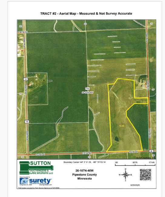 A 10% nonrefundable downpayment on the day of the sale with the balance on or before December 19, 2025, with full possession for the 2026 crop year and grazing season. Marketable Title will be conveyed and at the sellers’ option either abstracts of title or owners title insurance will be provided, if title insurance is utilized the cost of the owner’s policy will be divided 50-50 between the buyer(s) and sellers. The closing fee – O’Neill & Barduson Law Firm will be divided 50-50 between the buyer(s) and sellers. All of the RE taxes payable in 2025 will be paid by the sellers, with all of the RE taxes payable in 2026 to be paid by the buyer(s). The total acres being sold are being sold in accordance with a survey as completed by Stockwell Engineers, Inc., with the acres understood to be “more or less”. All survey costs will be paid by the sellers. The sellers do not guarantee that existing fences lie on the true and correct boundary and any new fencing, if any, will be the responsibility of the purchaser(s) pursuant to MN Law. FSA cropland acres, yields, bases, payments & other information are estimated and not guaranteed and if divided into multiple parcels will be subject to an FSA reconstitution & County Committee Approval and also are subject to pending action and implementation of the New Farm Bill. Information contained herein is deemed to be correct but is not guaranteed. This property is sold in “AS IS” CONDITION and subject to any existing easements, restrictions, reservations or highways of record if any, as well as any or all Pipestone County Zoning Ordinances. The RE licensees in this transaction are acting as agents for the seller. Sold subject to confirmation of the owners.