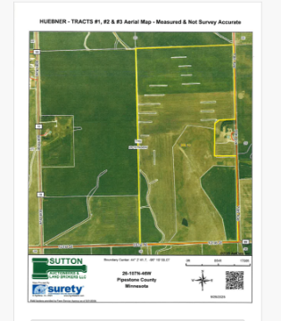 A 10% nonrefundable downpayment on the day of the sale with the balance on or before December 19, 2025, with full possession for the 2026 crop year and grazing season. Marketable Title will be conveyed and at the sellers’ option either abstracts of title or owners title insurance will be provided, if title insurance is utilized the cost of the owner’s policy will be divided 50-50 between the buyer(s) and sellers. The closing fee – O’Neill & Barduson Law Firm will be divided 50-50 between the buyer(s) and sellers. All of the RE taxes payable in 2025 will be paid by the sellers, with all of the RE taxes payable in 2026 to be paid by the buyer(s). The total acres being sold are being sold in accordance with a survey as completed by Stockwell Engineers, Inc., with the acres understood to be “more or less”. All survey costs will be paid by the sellers. The sellers do not guarantee that existing fences lie on the true and correct boundary and any new fencing, if any, will be the responsibility of the purchaser(s) pursuant to MN Law. FSA cropland acres, yields, bases, payments & other information are estimated and not guaranteed and if divided into multiple parcels will be subject to an FSA reconstitution & County Committee Approval and also are subject to pending action and implementation of the New Farm Bill. Information contained herein is deemed to be correct but is not guaranteed. This property is sold in “AS IS” CONDITION and subject to any existing easements, restrictions, reservations or highways of record if any, as well as any or all Pipestone County Zoning Ordinances. The RE licensees in this transaction are acting as agents for the seller. Sold subject to confirmation of the owners.