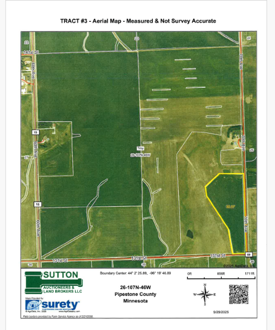 A 10% nonrefundable downpayment on the day of the sale with the balance on or before December 19, 2025, with full possession for the 2026 crop year and grazing season.  Marketable Title will be conveyed and at the sellers’ option either abstracts of title or owners title insurance will be provided, if title insurance is utilized the cost of the owner’s policy will be divided 50-50 between the buyer(s) and sellers.  The closing fee – O’Neill & Barduson Law Firm will be divided 50-50 between the buyer(s) and sellers.   All of the RE taxes payable in 2025 will be paid by the sellers, with all of the RE taxes payable in 2026 to be paid by the buyer(s).  The total acres being sold are being sold in accordance with a survey as completed by Stockwell Engineers, Inc., with the acres understood to be “more or less”.  All survey costs will be paid by the sellers.  The sellers do not guarantee that existing fences lie on the true and correct boundary and any new fencing, if any, will be the responsibility of the purchaser(s) pursuant to MN Law.  FSA cropland acres, yields, bases, payments & other information are estimated and not guaranteed and if divided into multiple parcels will be subject to an FSA reconstitution & County Committee Approval and also are subject to pending action and  implementation of the New Farm Bill.  Information contained herein is deemed to be correct but is not guaranteed.  This property is sold in “AS IS” CONDITION and subject to any existing easements, restrictions, reservations or highways of record if any, as well as any or all Pipestone County Zoning Ordinances.  The RE licensees in this transaction are acting as agents for the seller.  Sold subject to confirmation of the owners.