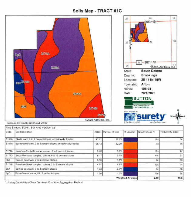 AUCTIONEERS NOTE:  This auction presents a great opportunity to purchase a productive parcel of cropland with some high-quality soils, a relatively high percentage tillable and a parcel comprised primarily of pasture.  This land has a superb location lying adjacent to a county highway and conveniently located between Bushnell & White SD and within 10 miles of Brookings, SD and Ethanol Facilities at Aurora, SD and the Soybean Processing Plant at Volga, SD. This land is situated in a prominent agricultural area in Afton  Township in Brookings County, SD. This land is available to the buyer to farm or lease as they desire in 2026.   If you are in the market for agricultural land in Brookings County, SD as an addition to an area row crop or crop/livestock operation or as an investment, then make plans to attend this auction, especially since this land will be offered in individual parcels and combinations of parcels to fit the needs of a wide variety of potential buyers.