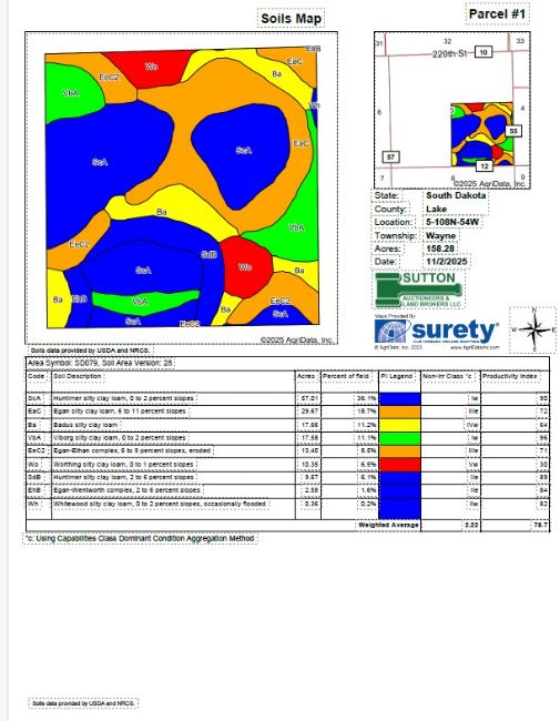 TRACT #1 - +/-158.28 Acres ; LEGAL DESC.: The SE ¼ of Sec. 5, T. 108N., R. 54W., (Wayne Twp.), Lake County, SD. - The configuration of both the FSA information and Lake County Assessor’s information do not conform with the manner in which the parcels are being offered for sale, so there is overlapping between the respective surveyed parcels being offered for sale. According to FSA information, presently the S½ of the SE¼ is identified as FSA Tr. 9993 which according to the FSA 156 EZ has approx. 77.07 acres of Farmland with approx. 65.91 acres of cropland with a 21.63 acre corn base with a 138 bu. PLC yield and a 21.97 acre soybean base with a 38 bu. PLC yield; FSA has the remainder of this farm identified as Tr. 10005 lying in the N½ SE¼ and the +/-100 acres in the SW¼ - which has approx. 172.03 acres of cropland with a 60.91 acre corn base with a 162 bu. PLC yield and a 63.64 acre soybean base with a 43 bu. PLC yield. According to info. obtained from the Lake County Assessor the SE¼ (Tr. #1) – has the overall soil ratings and RE taxes being assigned as 4 individual +/-40 acre parcels - which respectively for the NW¼ SE¼ has RE taxes of $988.26 and an OSR of .836; for the SW¼ SE¼ has RE taxes of $879.20 with an OSR of .796; for the NE¼ SE¼ has RE taxes of $856.22 with an OSR of .775; and on the SE¼ SE¼ has RE taxes of $783.40 with an OSR of .703. Comparatively, information obtained from Surety Agri-Data, Inc. indicates that Tract #1 with the SE¼ as a whole has a weighted soil productivity index of 78.7. The general topography of this land is gently rolling to rolling with some lower lying land in lowland areas. According to US Fish and Wildlife there are NO wetland conservation easements on this land.