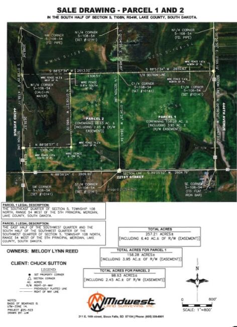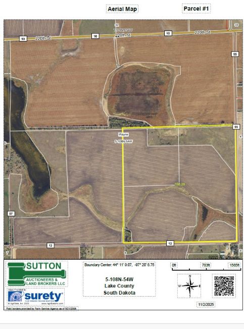 AUCTION TERMS: Cash - A 10% nonrefundable downpayment sale day with the balance on or before Jan. 22, 2026. Marketable Title will be conveyed and an owner’s title insurance policy will be provided with the cost of the owner’s policy and the closing agent’s fee (Weber Abstract & Title) to be divided 50-50 between the buyer(s) and sellers. All of the 2024 RE taxes payable in 2025 as well as all of the 2025 RE taxes payable in 2026 will be paid by the seller. The total acres being sold are based on a survey as completed by Midwest Land Surveying, Inc., with acres understood to be - more or less. The sellers do not warranty or guarantee that the existing fences lie on the true and correct boundary and new fencing, if any, will be the responsibility of the purchaser pursuant to SD law. FSA cropland, yields, bases & other information is estimated and not guaranteed and are subject to county committee approval. Information contained herein is deemed to be correct but is not guaranteed. This property is sold in “AS IS” CONDITION and subject to any existing easements, restrictions, reservations or highways of record if any, as well as any or all Lake County Zoning Ordinances. The RE licensees in this transaction are acting as agents for the agent for the owners. Sold subject to confirmation of the Owners.