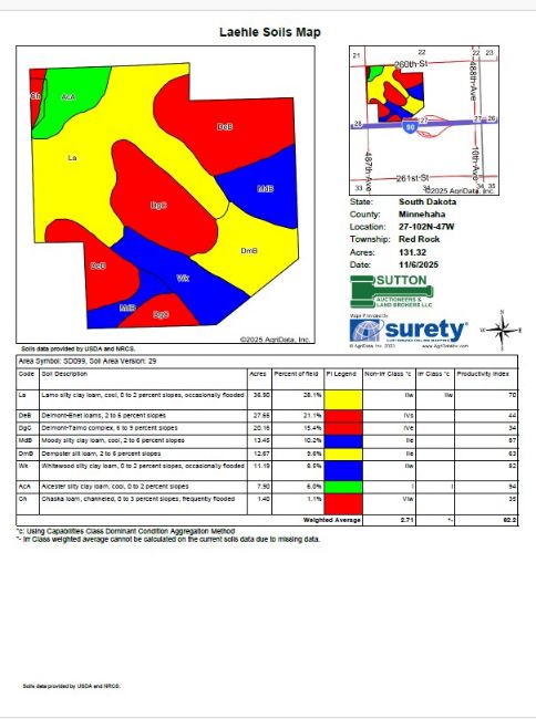 This auction presents an excellent opportunity to purchase a parcel of land that has been owned by the Laehle Family for over 60 years. This land would make a great addition to an area row crop farming operation or as an investment.  This property consists of a 133.36 acre surveyed parcel of land, which according to Minnehaha. County Planning and Zoning has 2 remaining rural housing eligibilities.  The exceptions from this property include 2 acreages and a portion of the SD Rest Area on I-90.   Also, in association with the rest area there is a scenic easement on +/-54.24 acres lying north and northwest of the rest area granted to the State of South Dakota granted in 1971, which restricts construction within the easement area, as well as other provisions of said easement, although there are no restrictions on agricultural farming practices.  The location of this property is unique in that the land is bordered on the south by I-90 with the SD Rest Area being located in an area in the southeast corner of this land with a portion of the Rest Area being carved out of this farm, additionally, this land is bordered on the west by 487th Ave. and on the north by 260th Street and is conveniently located between the Valley Springs-Garretson and the Pipestone-Jasper Exits on I-90 and is just ½ mile west of the Minnehaha County, SD & Rock County, MN State Line.   According to FSA information this property has approx.  131.37 acres of Farmland with approx. 129.87 acres of Cropland  with an FSA 59.38 acre corn base with a 166 bu. PLC yield and a 64.82 acre soybean base with a 46 bu. PLC yield and has been enrolled under the ARC County election for corn and soybeans of the USDA farm program.  The non-tillable acres in this farm are comprised primarily of small +/- 1.5 acre area comprised of some trees with a dugout located near the Northwest corner of the farm, with the remaining non-tillable acres comprised of a waterway and roads. According to the Minnehaha County Assessor currently this land is assessed in two parcels with parcel #013636 being 50 acres with a Soil rating of .629 and parcel #013637 being 82.83 acres with a soil rating of .562, comparatively information obtained from Surety Agri Data indicates this farm as a whole has a Soil Productivity Index of 62.2.  The total real estate taxes for 2024 and payable in 2025 on this property were $1,439.64 + $1,005.66 for a combined total of $2,445.30.   This land has a high percentage tillable with a gently rolling to rolling topography. This land is conveniently located to I-90 and within a short drive to Brandon, Valley Springs, Garretson & Sioux Falls, SD and also Luverne, Pipestone, Jasper & Hills, MN, as well as a number of area grain terminals.    LEGAL DESC.:  The  NW¼, less exceptions, in Sec. 27, T. 102N., R. 47W., (Red Rock Twp.), Minnehaha County, SD.