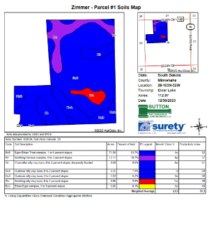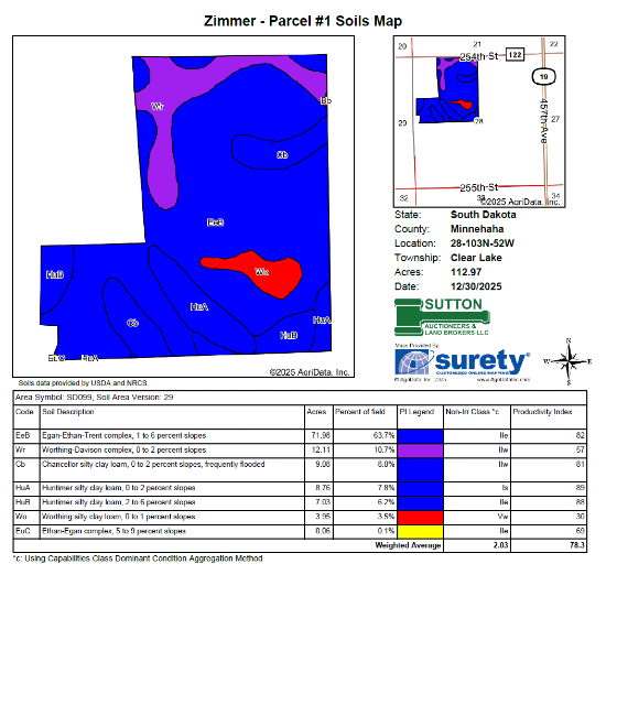AUCTIONEERS NOTE: Sutton Auctioneers & Land Brokers is privileged to offer this well located +/-150.33 Acre Clear Lake Twp., Minnehaha County, SD Land, bordered by an Oil Highway with 3 Remaining Rural Housing Eligibilities located within 20 minutes of Sioux Falls, SD! This farm offers a mixture of productive cropland as well as Hayland & Recreational Land with Areas Suitable for Hunting & Wildlife Habitat for the Hunter & Wildlife Enthusiast! It is especially noteworthy that this land has been in the Zimmer Family since it was homesteaded in 1877, making this a once in a lifetime opportunity to purchase this land!! The land will be offered in 2 individual parcels or as a unit. If you are in the market for productive Minnehaha County, SD Land to add to an area farming operation or investment, make plans to inspect this property & be in attendance at this auction!