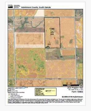 AUCTION TERMS: Cash - A 10% nonrefundable down payment on the day of the sale on each farm with the balance on or before April 29, 2026, with full possession for the 2026 crop year. Marketable Title will be conveyed and an owner’s title insurance policy will be provided with the cost of the owner’s policy and the closing agent’s fee (The Title Company in Mitchell, SD) to be divided 50-50 between the buyer and seller. All of the 2025 RE taxes payable in 2026 will be paid by the sellers. The total acres being sold will be sold in accordance with the acres as stated on a survey as completed by Registered Land Surveyor - Thomas Week, with the acres understood to be “more or less”. The sellers do not guarantee that existing fences lie on the true and correct boundary and any new fencing, if any, will be the responsibility of the purchaser(s) pursuant to SD Law. FSA cropland acres, yields, bases, payments & other information are estimated and not guaranteed & County Committee Approval and also are subject to pending action and implementation of the New Farm Bill. Information contained herein is deemed to be correct but is not guaranteed. This property is sold in “AS IS” CONDITION and subject to any existing easements, restrictions, reservations or highways of record if any, as well as any or all Hutchinson County Zoning Ordinances. The RE licensees in this transaction are acting as agents for the seller. Sold subject to confirmation of the owner.