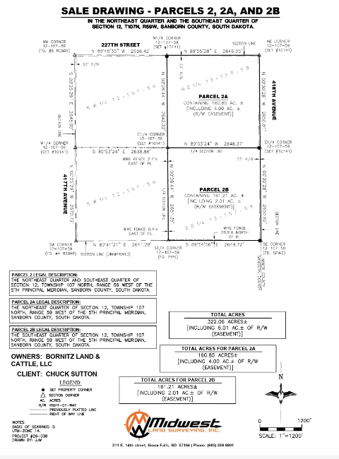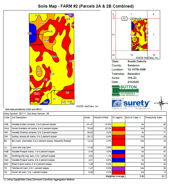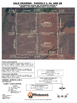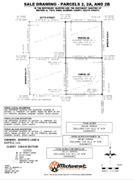 AUCTION TERMS: Cash – A 10% nonrefundable downpayment sale day and the balance on or before April 24, 2026, with full possession on sale day for the 2026 crop year. Marketable title will be conveyed with an owner’s title insurance policy provided with the cost of the Owner’s Policy and Closing Agent’s Fee (Fidelity Abstract & Title in Howard, SD) to be divided 50-50 between the buyer and seller. All of the 2025 RE taxes payable in 2026 will be paid by the seller. The total acres being sold will be adjusted to be in accordance with a recent survey as completed by Midwest Land Surveying, Inc., with the acres understood to be “more or less”. The seller does not guarantee that existing fences lie on the true and correct boundary and any new fencing, if any, will be the responsibility of the purchaser(s) pursuant to SD Law. FSA cropland and other information is estimated and not guaranteed and are subject to county committee approval. Information contained herein is deemed to be correct but is not guaranteed. This property is sold in “AS IS” CONDITION and subject to any existing easements, restrictions, reservations or highways of record if any, as well as any or all Miner and Sanborn County Zoning Ordinances. The Seller may desire to utilize this property in connection with a 1031 tax free exchange, and if so, the buyer will agree to cooperate with facilitation of the exchange, with any costs affiliated with the exchange to be paid by the seller. The RE licensees in this transaction are acting as agents for the sellers. Sold subject to confirmation of the owners.