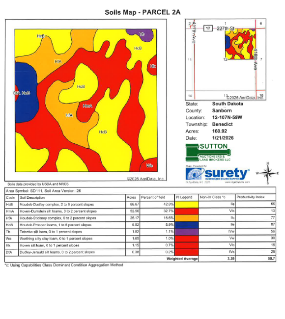 FARM #2 is a +/-320 acre parcel of land which has a high percentage tillable and good eye appeal; and also has some areas with waterway, 2 dugouts and other pockets that provide some areas that could be developed to accentuate the potential hunting and recreational opportunities, especially since this land is located in one of the more highly regarded hunting areas for pheasants, deer and other wildlife in Eastern, SD.  According to FSA information this farm has approx. 316.23 acres of Farmland with 310.02 acres of Cropland with a 76.12 acre corn base with a 104 bu. PLC yield and a 64.29 acre soybean base with a 40 bu. PLC yield, an 8.27 acre wheat base with a 52 bu. PLC yield and an incidental oats base.  According to information obtained from the Sanborn County Assessor and Surety Agri-Data this farm has an overall soil rating  on Parcel 2A (the NE¼) from the County of .645 and on  Surety has a 50.7; Parcel 2B (the SE¼) from the County of a .693 and on Surety has a 52.5; comparatively, info. obtained from Surety Agri-Data indicates this land has a productivity soils index on FARM #2 (Parcels 2A & 2B Combined of a 51.7).   The general topography of this land is predominately level to gently rolling.  The 2025 RE taxes payable in 2026 on this property on Farm #2 on #2A in the NE¼ are $1,821.38 and on #2B in the SE¼ are $1,718.44.