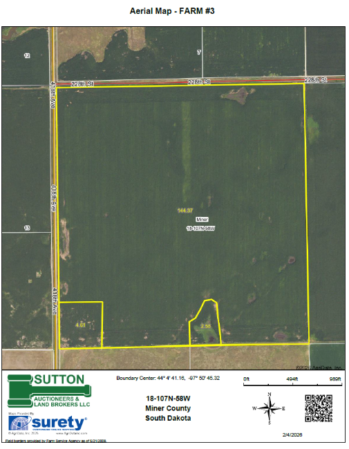 AUCTION TERMS: Cash – A 10% nonrefundable downpayment sale day and the balance on or before April 24, 2026, with full possession on sale day for the 2026 crop year. Marketable title will be conveyed with an owner’s title insurance policy provided with the cost of the Owner’s Policy and Closing Agent’s Fee (Fidelity Abstract & Title in Howard, SD) to be divided 50-50 between the buyer and seller. All of the 2025 RE taxes payable in 2026 will be paid by the seller. The total acres being sold will be adjusted to be in accordance with a recent survey as completed by Midwest Land Surveying, Inc., with the acres understood to be “more or less”. The seller does not guarantee that existing fences lie on the true and correct boundary and any new fencing, if any, will be the responsibility of the purchaser(s) pursuant to SD Law. FSA cropland and other information is estimated and not guaranteed and are subject to county committee approval. Information contained herein is deemed to be correct but is not guaranteed. This property is sold in “AS IS” CONDITION and subject to any existing easements, restrictions, reservations or highways of record if any, as well as any or all Miner and Sanborn County Zoning Ordinances. The Seller may desire to utilize this property in connection with a 1031 tax free exchange, and if so, the buyer will agree to cooperate with facilitation of the exchange, with any costs affiliated with the exchange to be paid by the seller. The RE licensees in this transaction are acting as agents for the sellers. Sold subject to confirmation of the owners.