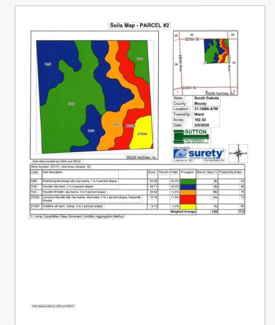 PARCEL #2 - +/-162.52 Surveyed Acres – Legal Desc.:  The NE ¼ of Sec. 31, T. 108N., R. 47W., (Ward Twp.), Moody County, SDAccording to info. obtained from Surety Agri Data the land included in PARCEL 2 (NE ¼) has a Soil Productivity Index of 77.9, with the majority of the land considered as cropland being comprised of Class II soils with the lowland pasture/drainage/waterway  (+/-19.65 acres as indicated by Surety) being Class VIw soil.  The cropland acres have a generally gently rolling to rolling topography, with some lower lying land in the pasture/waterway/drainage.  According to an FSA estimate, it appears that the NE ¼ currently has approx. 128.95 acres of cropland with the remainder being utilized has pasture/hayland, waterway and roads. FSA INFORMATION FOR PARCEL #2 (NE ¼) and PARCEL #3 (W ½ SE ¼) – Presently FSA has both of these parcels combined into one operating unit as FSA Tract 1861, which together the FSA 156 EZ indicates has approx. 237.90 acres of Farmland with 197.66 acres of Cropland with a 78 acre corn base with a 108 bu. PLC yield, a 31.40 acre Wheat base with a 29 bu. PLC yield, a 25.80 acre soybean base with a 30 bu. PLC yield and a 4.80 acre oats base with a 62 bu. PLC yield.